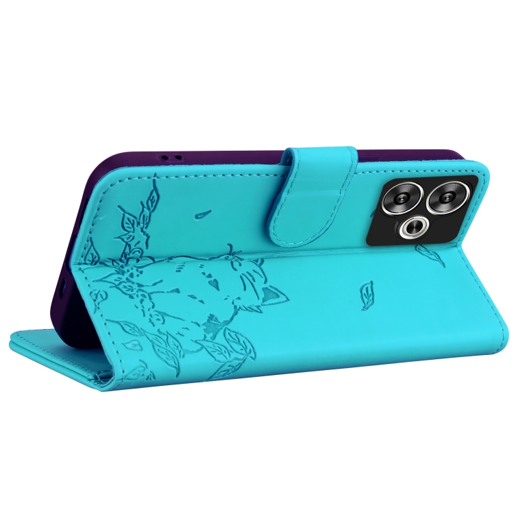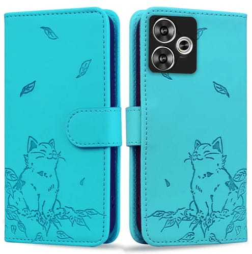 Funda de Piel con Estampado de Gato para Xiaomi Poco F6 (Azul Lago)