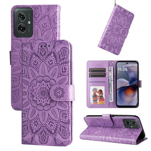 Funda de Piel para Motorola Moto G55 con Estampado de Girasoles en Relieve (Morado)