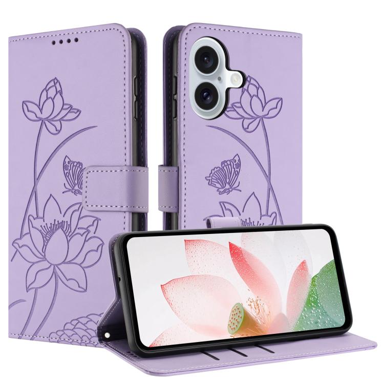 Funda de piel con relieve de loto para iPhone 17 con cordón (morado)