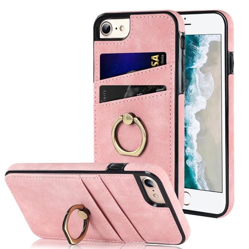 Funda de Teléfono de Cuero con Parche Vintage con Soporte para Anillo para iPhone Se 2022 / Se 2020 / 8 / 7 (Rosa)