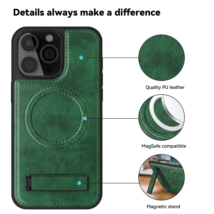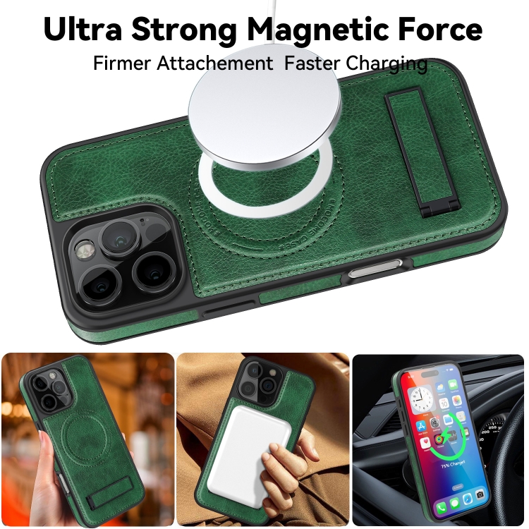 Funda de teléfono PU con soporte multifunción Magsafe para iPhone 16 (Verde)