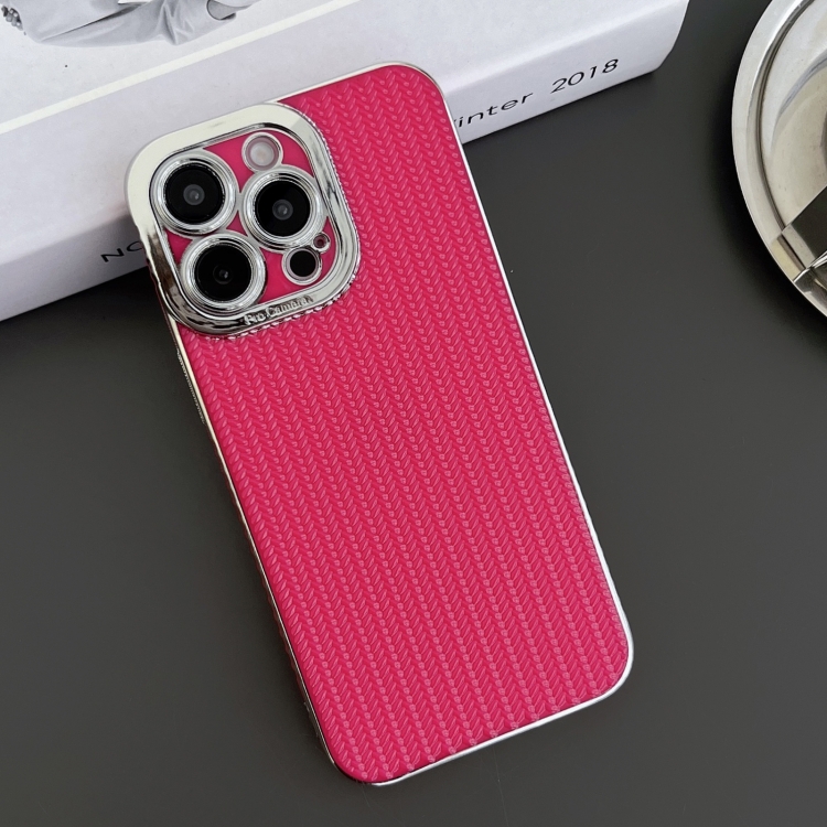 Funda de Teléfono TPU con Textura Granulada y Borde Plateado Galvanizado para iPhone 16 (Rojo Rosa)