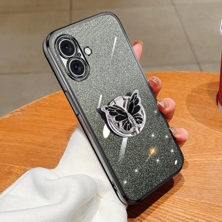 Funda TPU con Soporte Mariposa Purpurina Degradada para iPhone 16 (Negro)