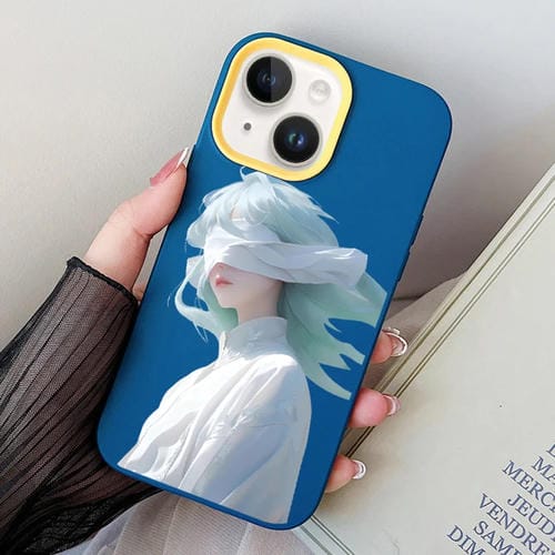 Funda híbrida TPU para iPhone 14 Plus diseño chica con ojos vendados (Azul Real)
