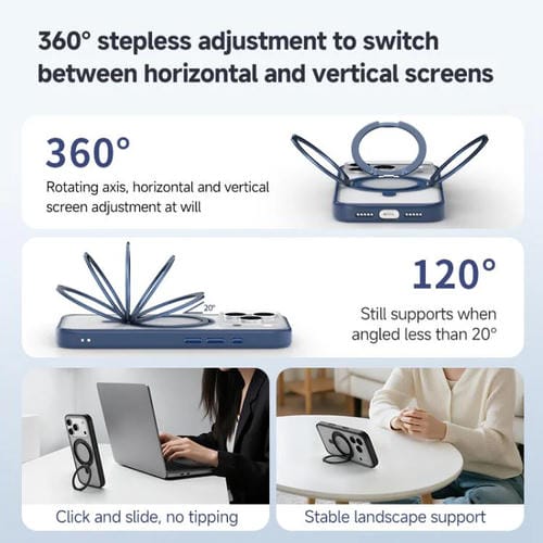 1. Soporte ajustable de 360 ​​grados: Rotación continua con bisagra de aleación de grado aeroespacial, que permite un cambio suave entre modo vertical y horizontal;duradero y difícil de romper.