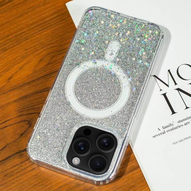 Funda MagSafe con purpurina degradada y estrellas para iPhone 16 Pro Max (plata degradada)