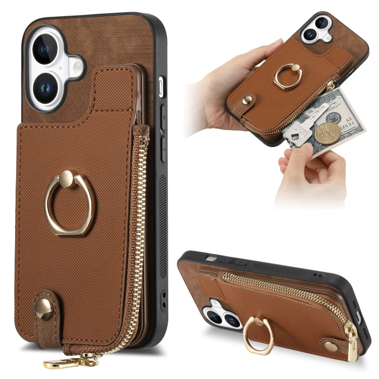 Funda para iPhone 16 con Cremallera Vertical y Anillo Cruzado de Cuero (Marrón)