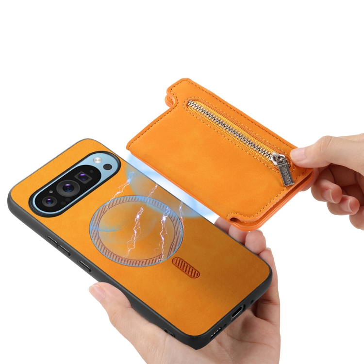 Funda para Teléfono Google Pixel 8 Pro con Cremallera Magsafe Retro y Tarjeta (Amarilla)