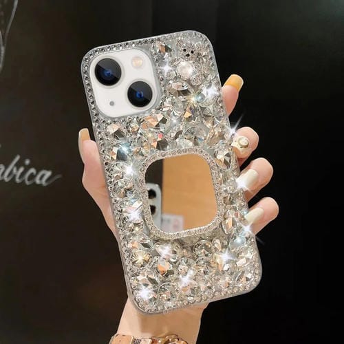 Funda para Teléfono iPhone 13 Mini con Espejo y Diamantes de Imitación Hecha a Mano (Cuadrado Gris Plateado)