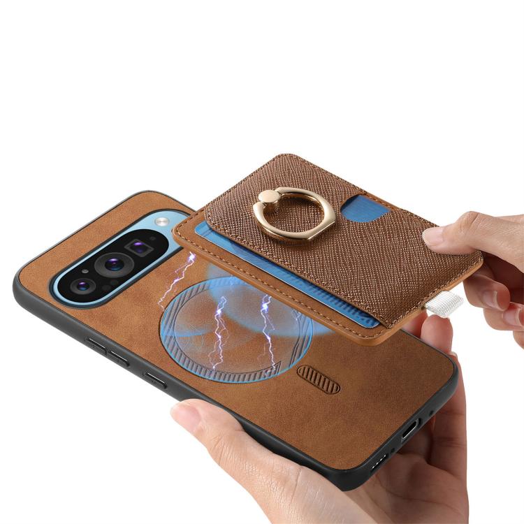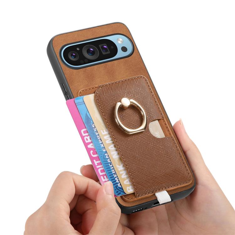 Funda para Teléfono Google Pixel 8A con Ranuras para Tarjetas, Diseño Cruz de Cuero y Anillo Lateral (Marrón)