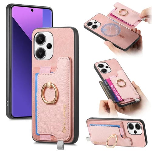 Funda para Teléfono con TaRJetero y Anillo de Cuero con Diseño Retro Magsafe Cross para Redmi Note 13 Pro+ (Rosa)