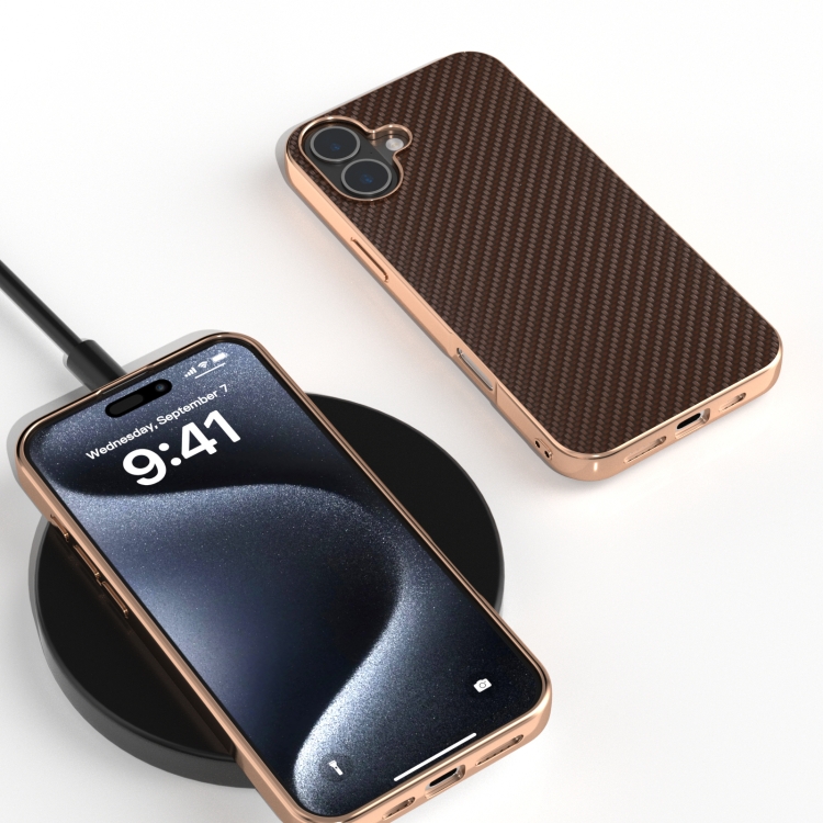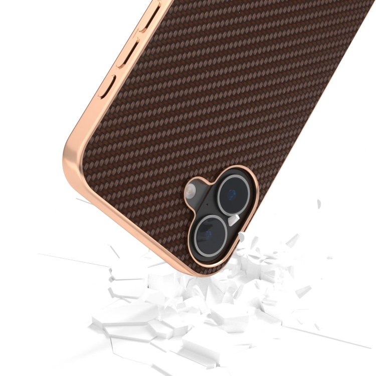 Funda para teléfono iPhone 16 con textura de fibra de carbono y nano galvanoplastia (Marrón Oscuro)