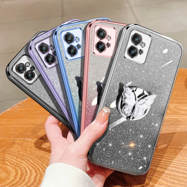 Funda TPU con Soporte Mariposas y Purpurina Degradada Plateada para Motorola Moto G32 (Rosa)