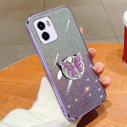 Funda para Teléfono de TPU con Soporte para Mariposas con Purpurina Degradada Plateada para Vivo Y10/Y15S 2021 (Morado)