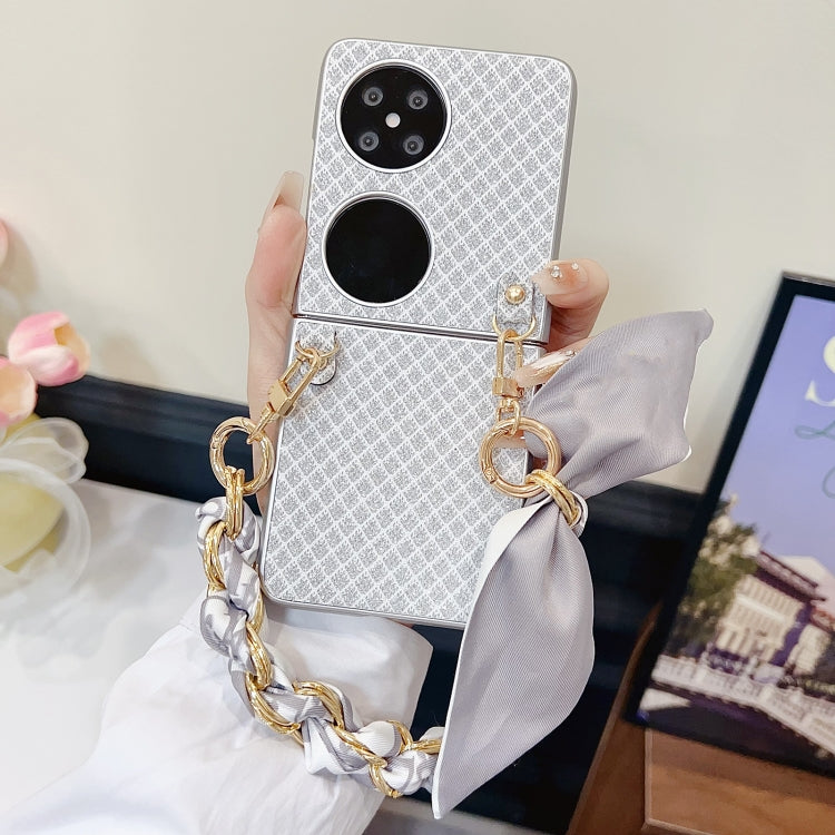 Funda para Teléfono Huawei P50 Pocket con Rombos, Diamantes y Pulsera de Seda (Plateada)