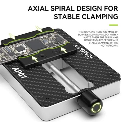 La Placa Base Luowei LW-AP01 es un Accesorio diseñado para la sujeción precisa de chips durante procesos de Reparación y mantenimiento electrónico. Fabricada en fibra de carbono de alta temperatura, este Componente ofrece una alta resistencia térmica y durabilidad, ideal para entornos de trabajo que requieren estabilidad y protección contra el calor. Su diseño innovador en color Gris Titanio incluye una estructura con abrazaderas ajustables a 45 grados, compatibles con múltiples tipos de chips, lo que facilita la manipulación sin riesgo de daños. La construcción en aleación de aluminio con acabado mate garantiza una sujeción firme y estable mediante un mecanismo en espiral axial, optimizando la seguridad durante la Reparación de Placas Base genéricas.