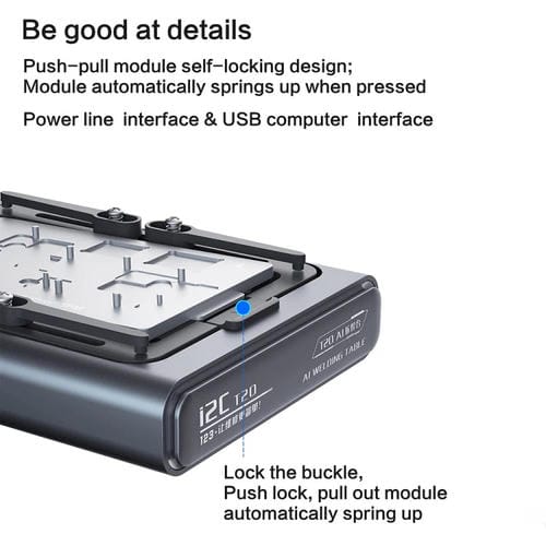 El Módulo de plataforma de calefacción I2C T20 está diseñado específicamente para la serie iPhone 14, ofreciendo una solución técnica avanzada para la reparación y mantenimiento de la Placa Base. Este componente permite un control inteligente de la temperatura durante procesos de calentamiento, asegurando la protección del circuito principal y facilitando la manipulación segura de la Placa Base. Su diseño segmentado y hueco permite una expansión Flexible, con la posibilidad de ajustar o retirar las hebillas según la necesidad del usuario. El Módulo es compatible exclusivamente con la plataforma de calentamiento de Placa Base I2C T20, proporcionando un calentamiento eficiente en 30 segundos y un estratificado en 120 segundos, optimizando el proceso de reparación de dispositivos de la serie iPhone 14.