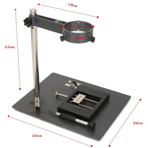 La estación de soldadura de retrabajo Kaisi F-201 es un equipo profesional diseñado para facilitar las tareas de reparación electrónica que requieren la manipulación precisa de pistolas de calor de aire caliente. Este Soporte con abrazadera es compatible con diversas pistolas de aire caliente, ofreciendo una Base estable y ajustable para trabajos de retrabajo y soldadura en Placas de circuito impreso. Su función principal es proporcionar un Soporte seguro que permita girar la pistola 360 grados y ajustar la altura dentro de un rango óptimo para mejorar la ergonomía y eficiencia durante el proceso de reparación.