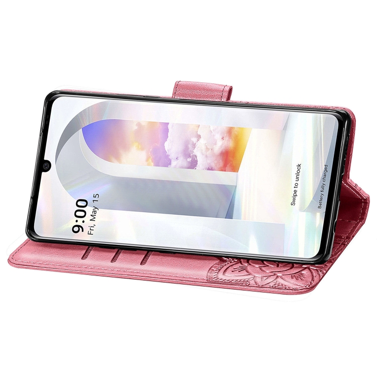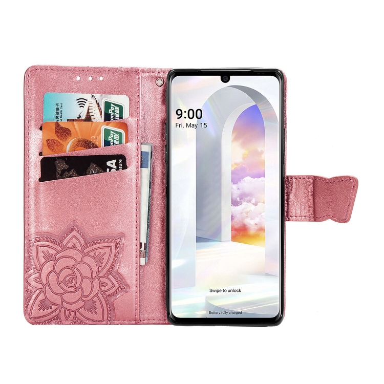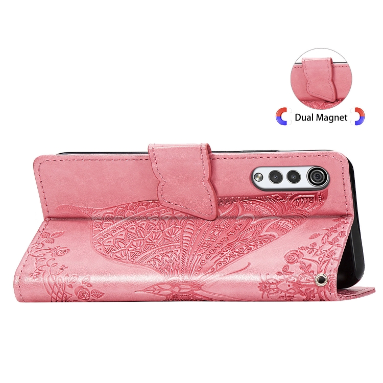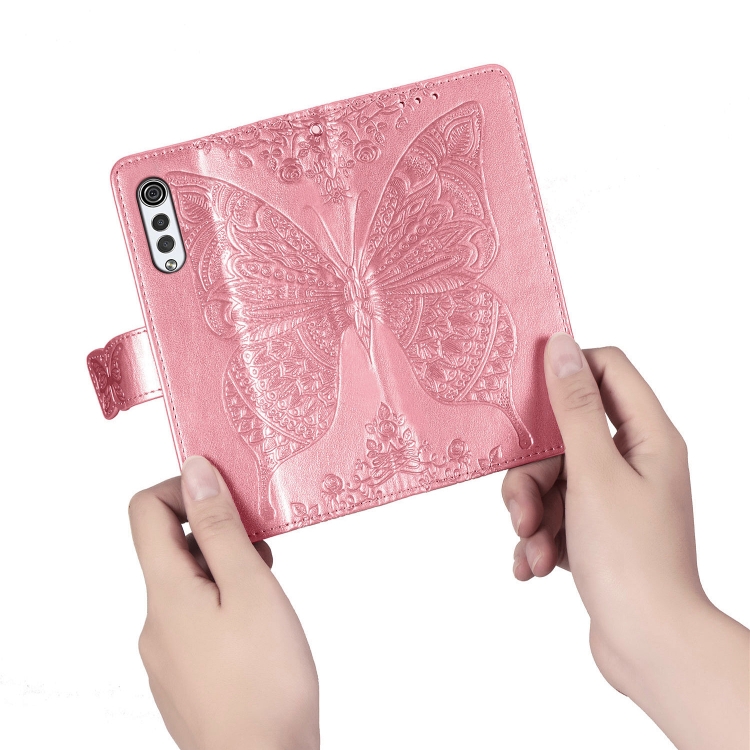 Funda Cuero Estampado Mariposa Amor con Soporte, Tragamonedas, Billetera y Cordón para LG Velvet 2 Pro (Rosa)