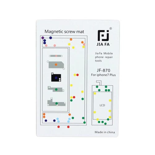 La alfombrilla con tornillos magnéticos JIAFA para iPhone 7 Plus (2016) es una herramienta especializada diseñada para facilitar la organización y manipulación de tornillos durante procesos de reparación y mantenimiento del dispositivo. Compatible exclusivamente con el modelo iPhone 7 Plus, esta estera magnética permite ubicar cada tornillo en su posición correspondiente, evitando pérdidas y mezclas que puedan complicar el ensamblaje posterior. Su función principal es proporcionar un espacio seguro y ordenado donde los tornillos se adhieren mediante magnetismo, ayudando a técnicos y usuarios que reparan por cuenta propia a mantener un control preciso durante intervenciones Técnicas en el Teléfono Móvil.