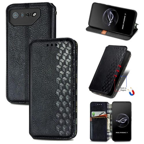 Funda para Asus Rog Phone 7 Cuero Magnético Prensado con Rejilla Cúbica (Negro)