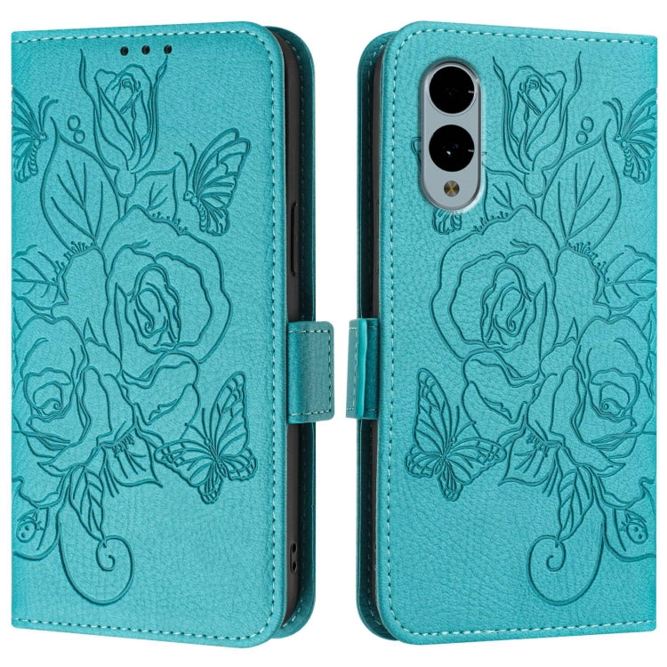 Funda de Cuero Antirrobo RFID para Fujitsu Arrows We2 con Relieve de Rosa (Azul Claro)