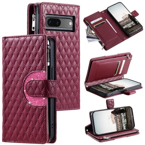 Funda de Cuero Glitter Lattice Zipper para Google Pixel 7 5G (Rojo Vino)