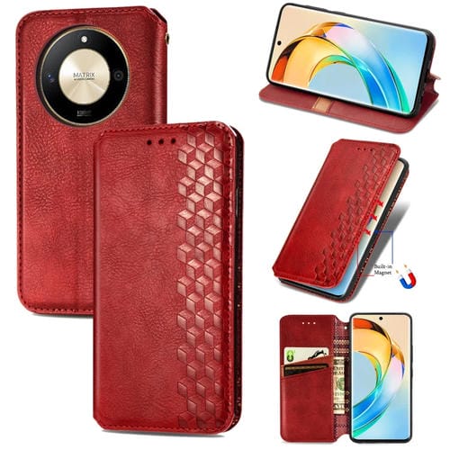 Funda para Honor X50 Cubic Grid de Cuero Magnético Prensado (Rojo)