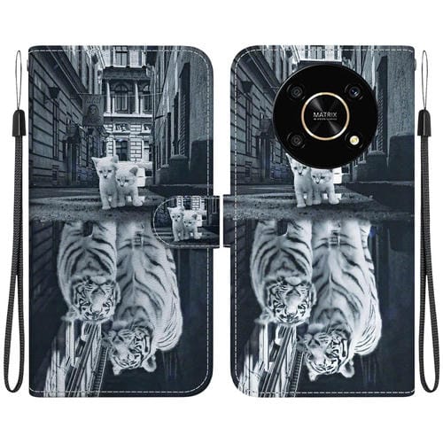 Funda de Cuero para Honor X9 5G con Dibujo Coloreado y Textura de Cristal (Reflejo de Tigre Gato)
