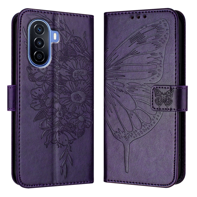 Funda para Huawei Enjoy 50 4G y Nova Y70 Plus de Cuero con Mariposa en Relieve (Púrpura Oscuro)