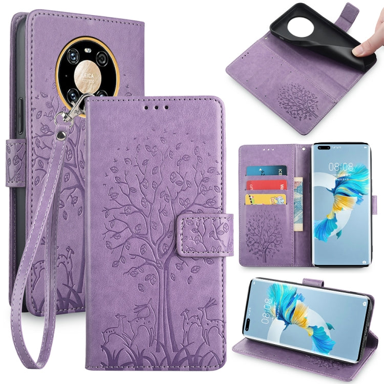 Funda de Cuero Huawei Mate 40 Pro con Relieve de Árbol y Ciervo (Púrpura)