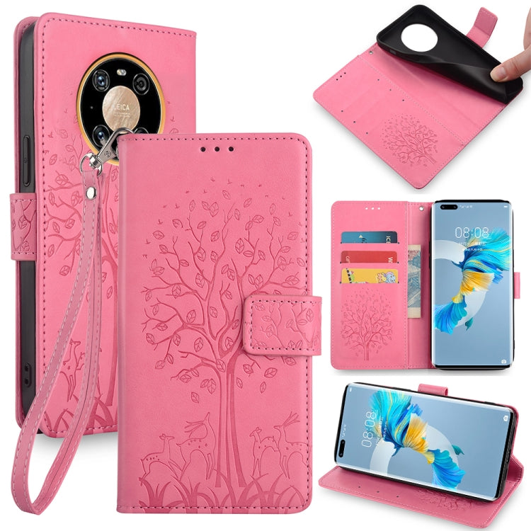 Funda de Cuero para Huawei Mate 40 Pro con Relieve de Árbol y Ciervo (Rosa)