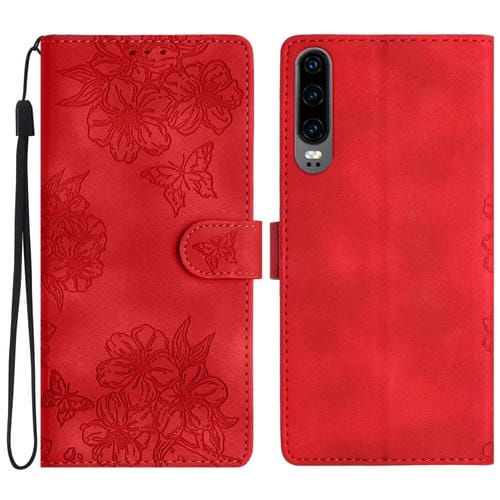 Funda para Huawei P30 Cherry Blossom Butterfly Skin Feel de PU en Relieve (Rojo)