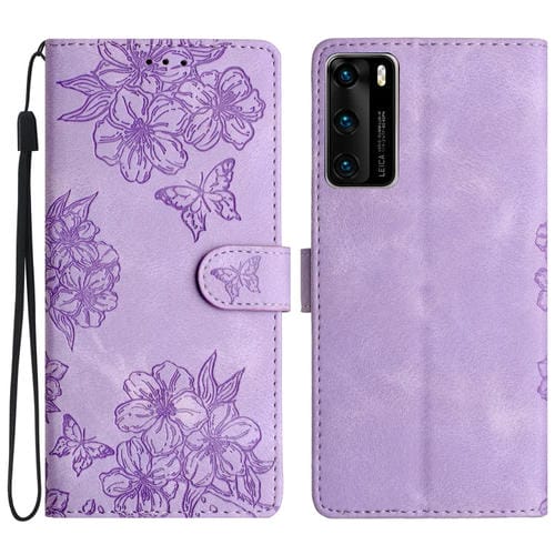 Funda para Huawei P40 Cherry Blossom Butterfly Skin Feel de PU en Relieve (Púrpura)