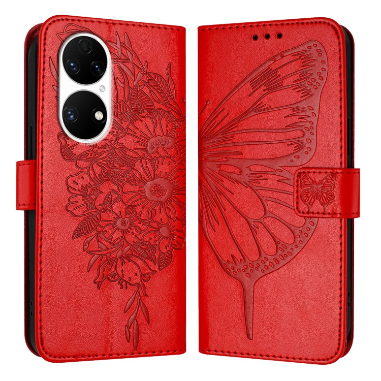 Funda de Cuero para Huawei P50 con Mariposa en Relieve (Rojo)