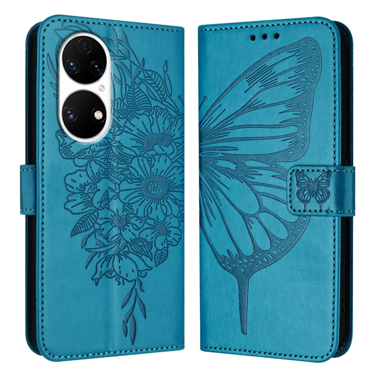 Funda de Cuero Huawei P50 Pro con Mariposa en Relieve (Azul)