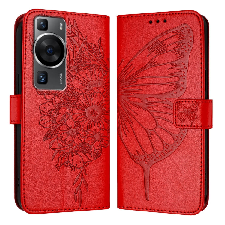 Funda de Cuero para Huawei P60 y P60 Pro con Mariposa en Relieve (Rojo)