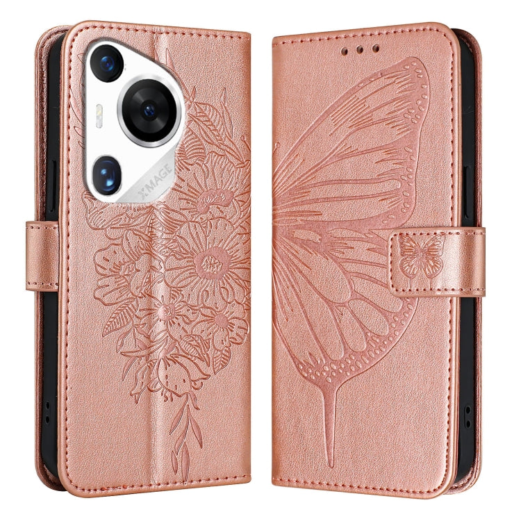 Funda de Cuero para Huawei Pura 70 Pro con Mariposa en Relieve (Oro Rosa)