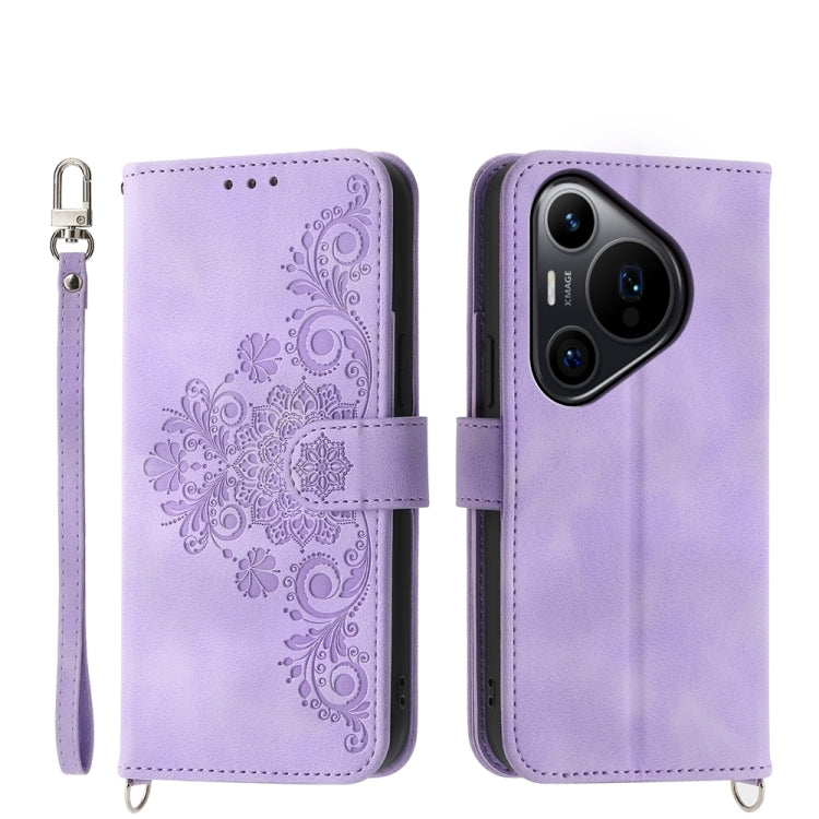 Funda de Cuero Huawei Pura 70 Pro / Pura 70 Pro+ con Billetera en Relieve y Flores (Púrpura)