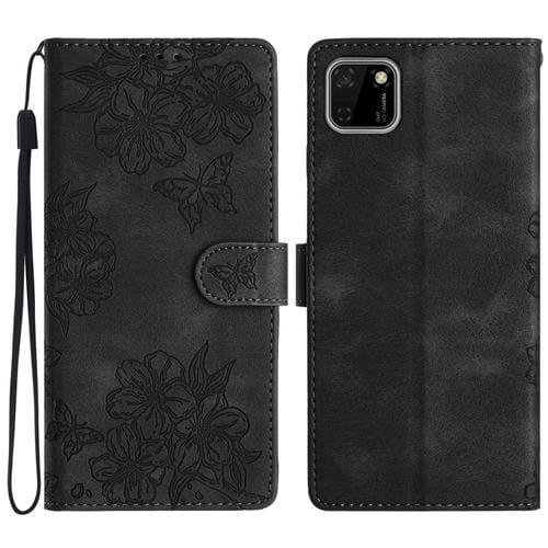 - 1x Funda para Huawei Y5P Honor 9S Cherry Blossom Butterfly Skin Feel de PU en relieve (Negro)