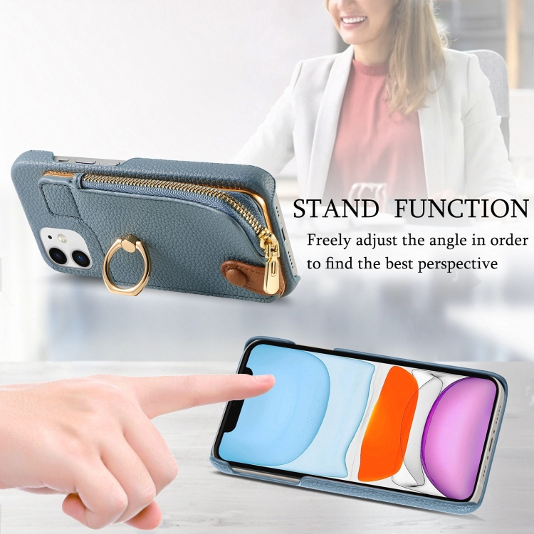 Funda Trasera para iPhone 11 con Billetera, Cremallera y Anillo de Cuero Litchi (Azul Claro)