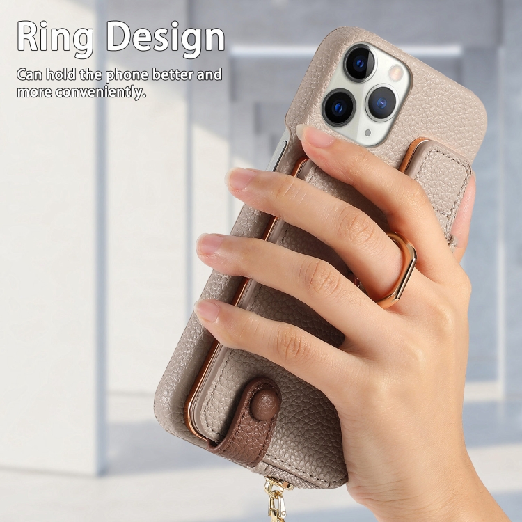 Funda Trasera para iPhone 11 Pro con Billetera, Cremallera y Anillo Cuero Litchi (Caqui)