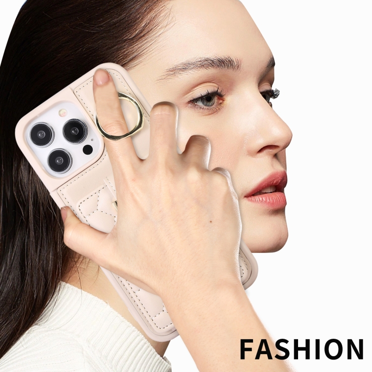 Funda para iPhone 11 Pro Max Vertical Card Bag Ring Holder con Doble Cordón (Beige)