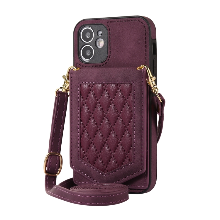 Funda para iPhone 11 Rhombic Texture Rfid con Cordón y Espejo (Rojo Vino)