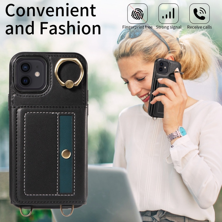 Funda de Cuero para iPhone 12/12 Pro con Soporte para Anillo y Bolso Cruzado para Tarjetas (Negro)