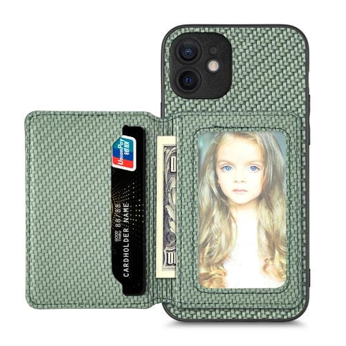 Caja de Teléfono para iPhone 12 Mini con Bolsa de Tarjeta Magnética de Fibra de Carbono (Verde)