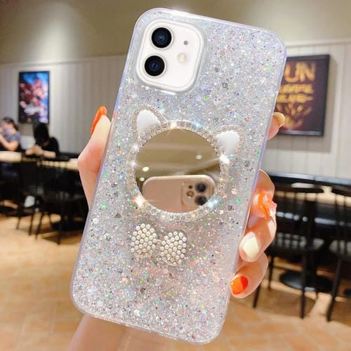 Estuche para Teléfono TPU Epoxi iPhone 12 Mini con Espejo y Orejas de Gato con Lentejuelas Estrelladas (Plateado)