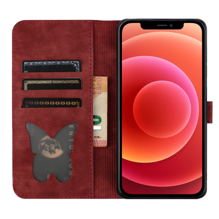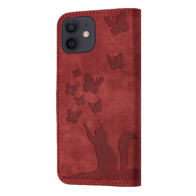Funda de Cuero para iPhone 12 Mini con Tapa y Estampado de Gato Mariposa (Rojo)