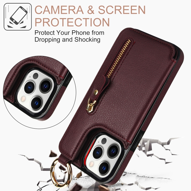 Funda para Teléfono iPhone 12 Pro Litchi Texture Cremallera Doble Hebilla con Bolsa para Tarjetas (Rojo Granate)