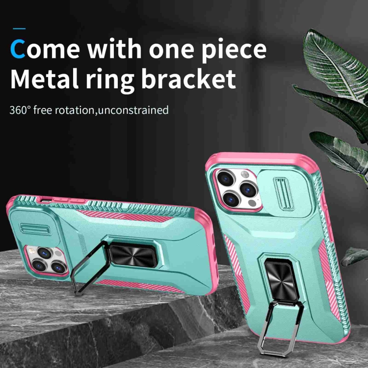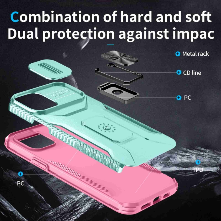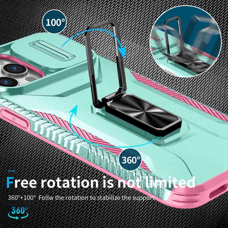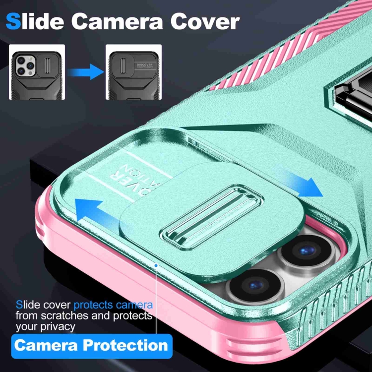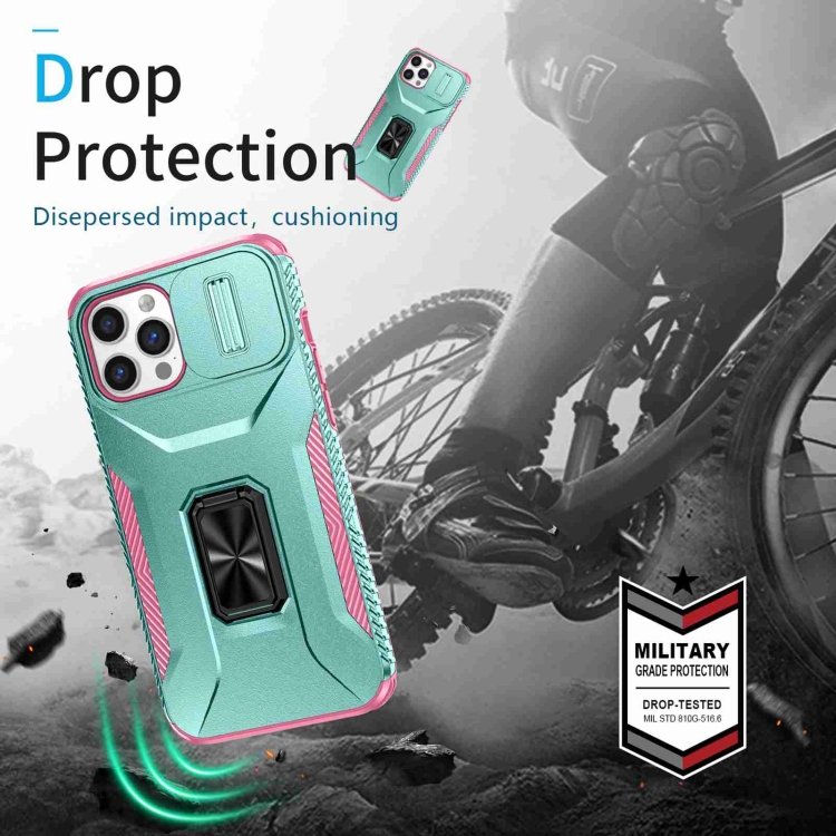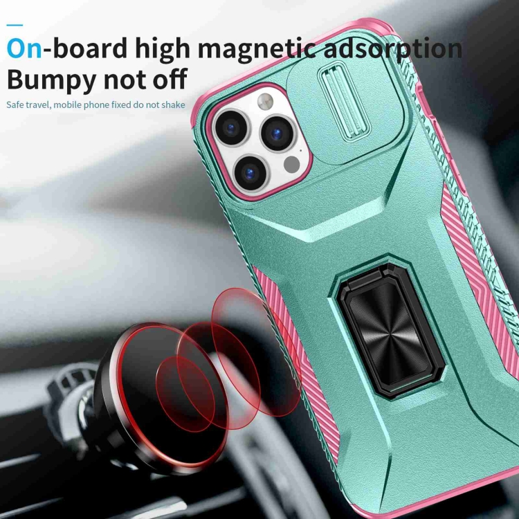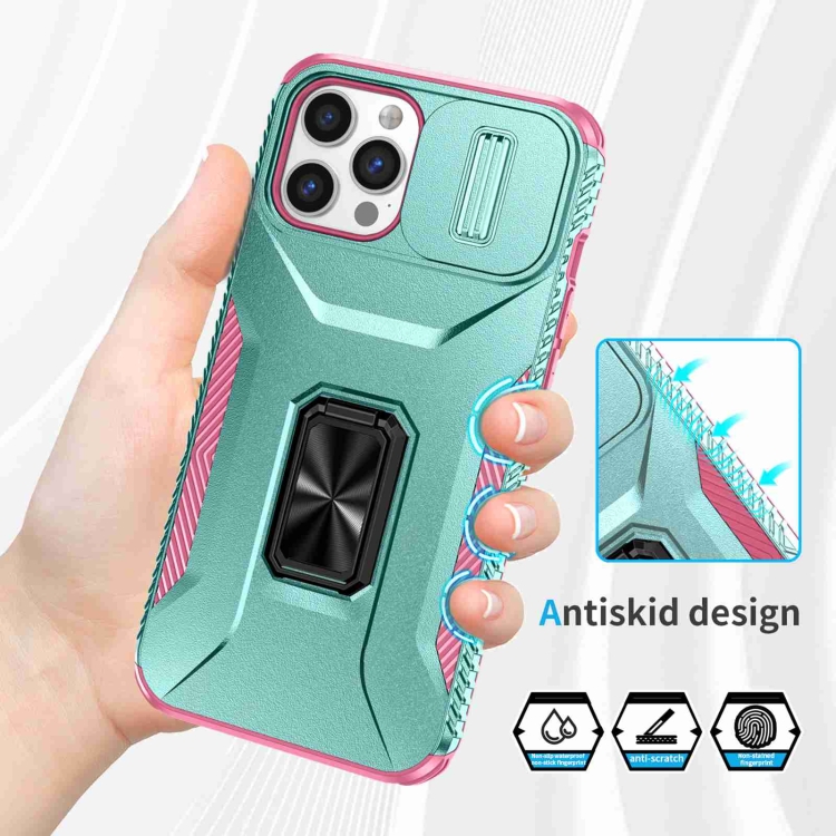 Estuche para teléfono iPhone 12 Pro Max con soporte deslizante para levas (Gris Verde + Rosa)